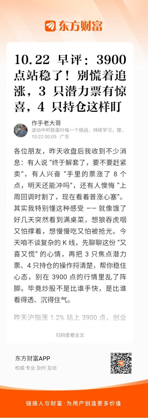 各位朋友,昨天收盘后我收到不少消息:有人说 “终于解套了,要不要赶紧卖”,有人兴奋 “手里的票涨了 8 个点,明天还能冲吗”,还有人懊悔 “上周回调时割了,现在看着普涨心塞”。其实我特别懂这种感受 —— 就像饿了好几天突然看到满桌菜,想狼吞虎咽又怕撑着,想慢慢吃又怕被抢光。今天咱不谈复杂的 K 线,先聊聊这份 “又喜又慌” 的心情,再把 3 只焦点潜力票、4 只持仓的操作捋清楚,帮你稳住心态,别在 3900 点的行情里乱了阵脚。毕竟炒股不是比谁手快,是比谁看得透、沉得住气。