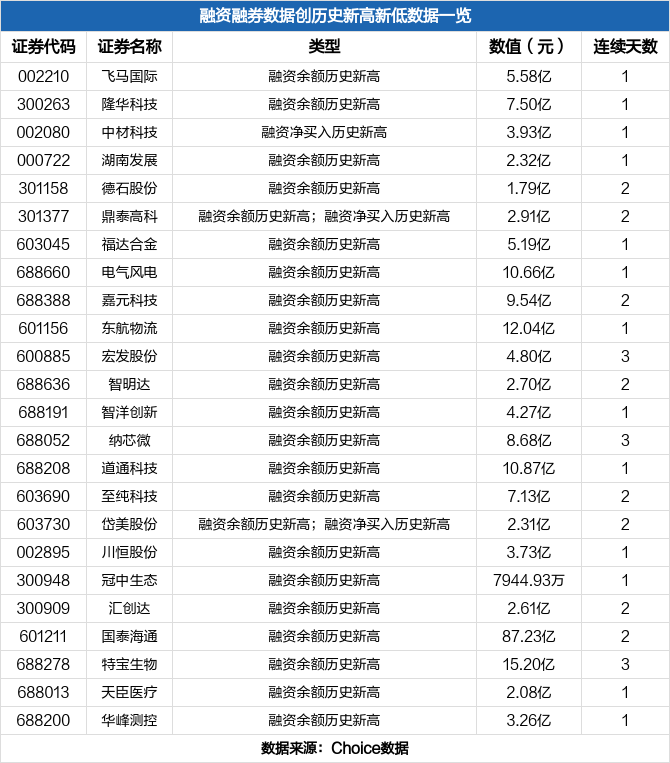 10月22日沪深两市共有93只股票两融数据创历史新高/新低,部分数据如下: