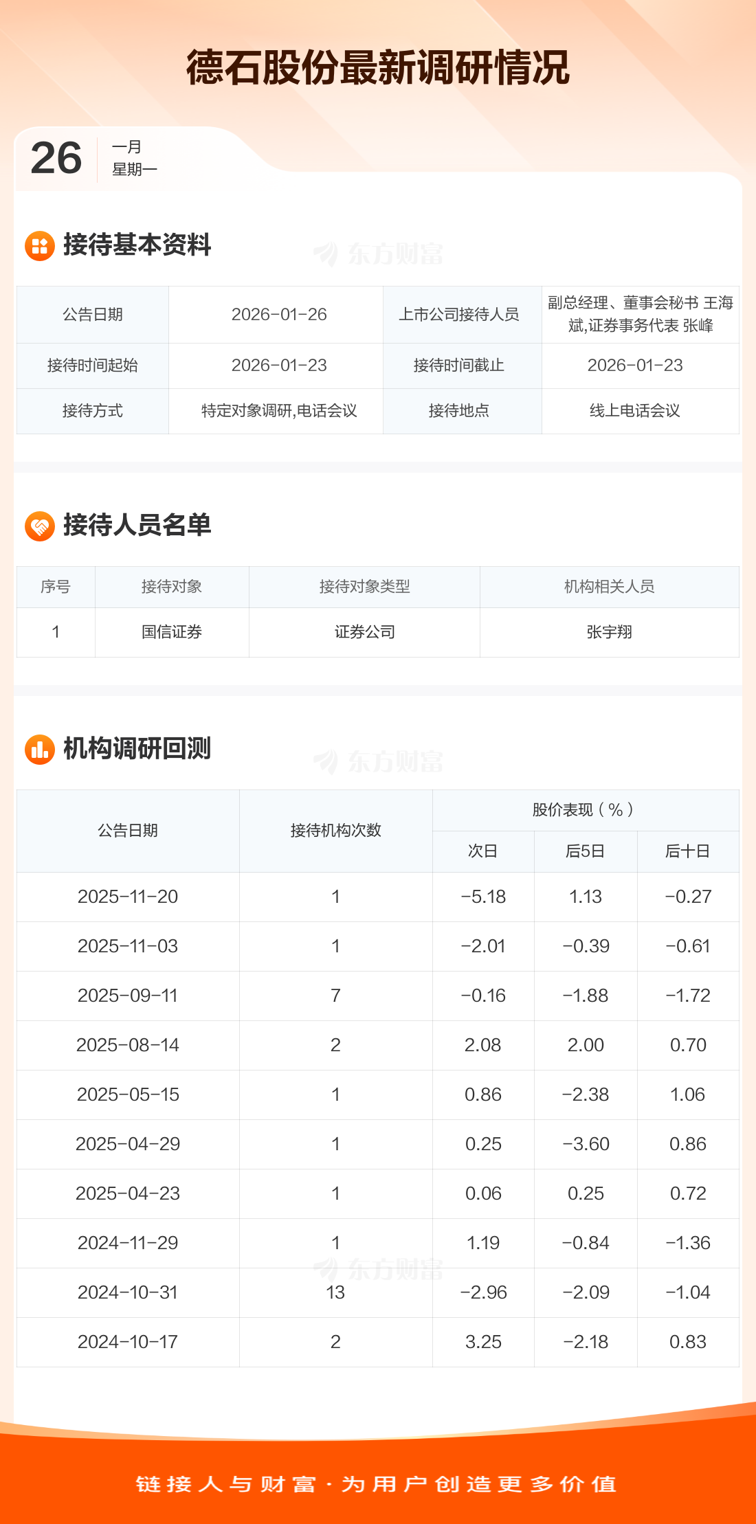 德石股份1月26日公告称,1月23日接待国信证券等1家机构调研。接待人员包括副总经理、董事会秘书 王海斌,证券事务代表 张峰。