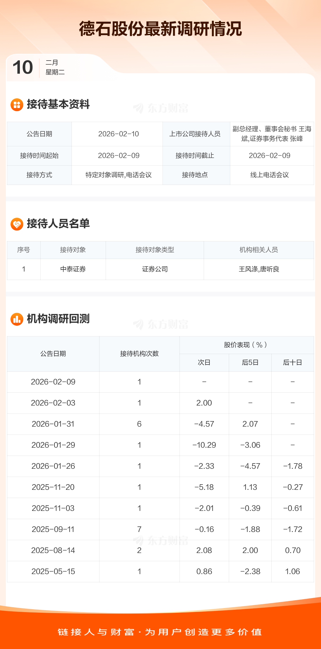 德石股份2月10日公告称,2月9日接待中泰证券等1家机构调研。接待人员包括副总经理、董事会秘书 王海斌,证券事务代表 张峰。