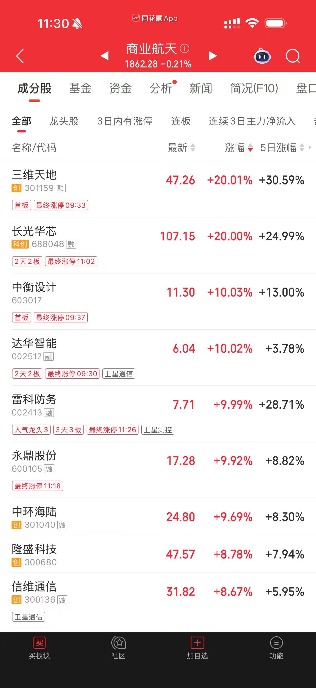 截至上午收盘,三维天地(301159)、长光华芯(688048)达成“20cm”涨停,中衡设计(603017)、达华智能(002512)、雷科防务(002413)、永鼎股份(600105)等多股涨停,中环海陆(301040)、乾照光电(300102)、信维通信(300136)、隆盛科技(300680)等个股涨超8%。