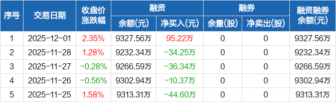 唯万密封:融资净买入95.22万元,融资余额9327.56万元(12-01)