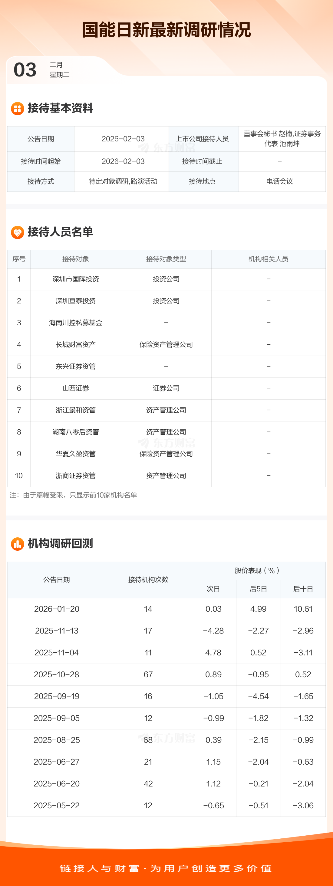 国能日新2月3日公告称,2月3日接待深圳市国晖投资等72家机构调研。接待人员包括董事会秘书 赵楠,证券事务代表 池雨坤。
