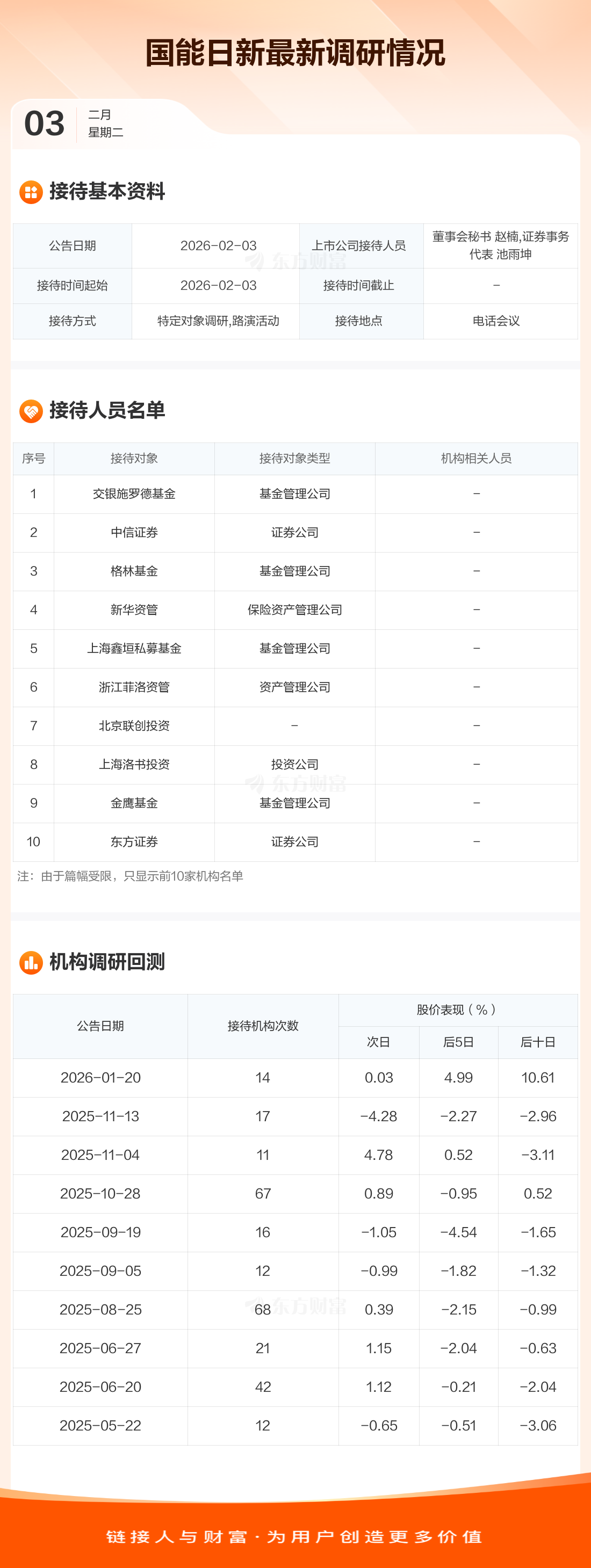 国能日新2月3日公告称,2月3日接待交银施罗德基金等72家机构调研。接待人员包括董事会秘书 赵楠,证券事务代表 池雨坤。