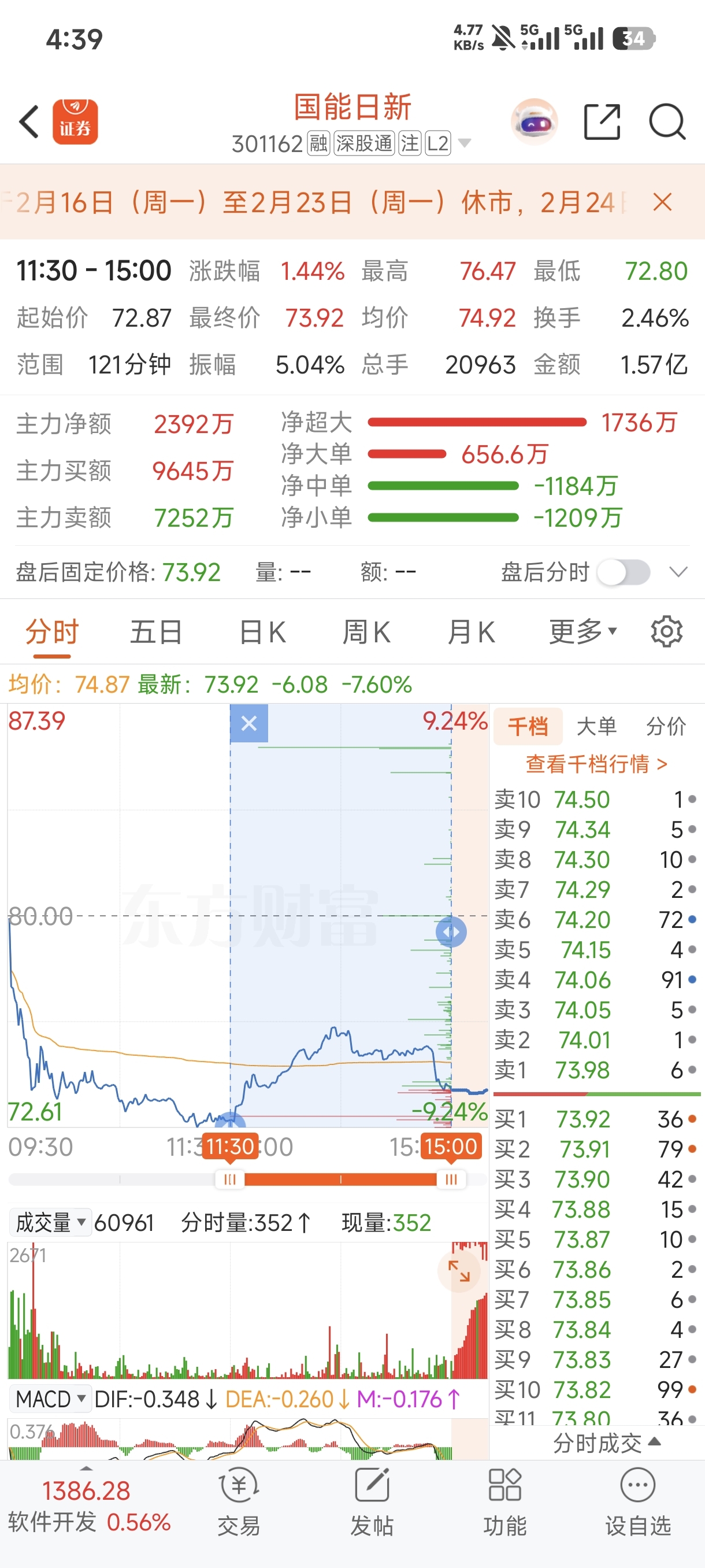 $国能日新(SZ301162)$ 拆分成上午和下午可以发现,上午净流出3300万,下午净流入2392万,今天是节前最后一个可卖出出金日,部分资金有提现需求,明日看修复,不排除新高可能。