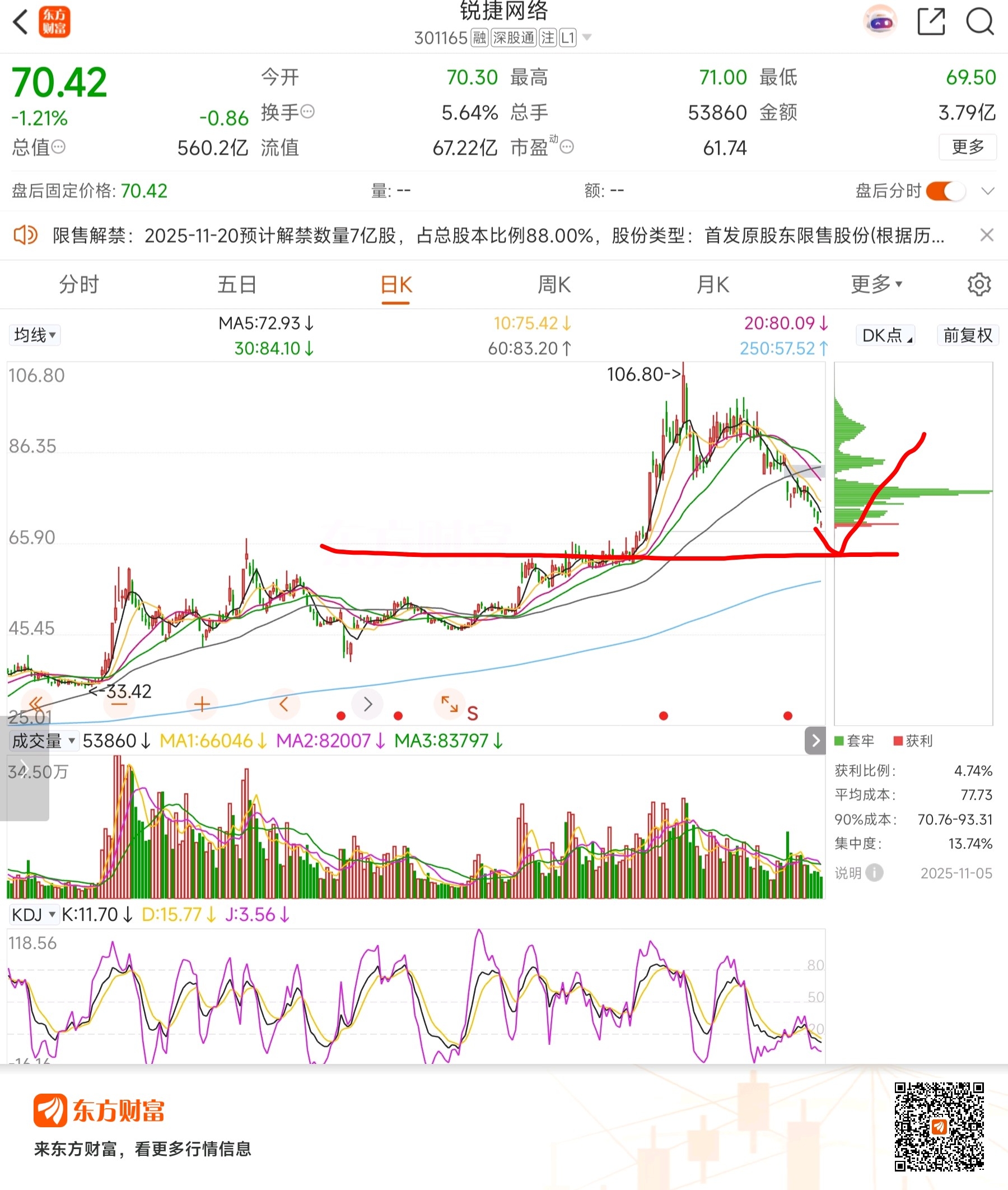 $锐捷网络(SZ301165)$ 还差一根阴线就到支撑了,你准备好子弹了吗