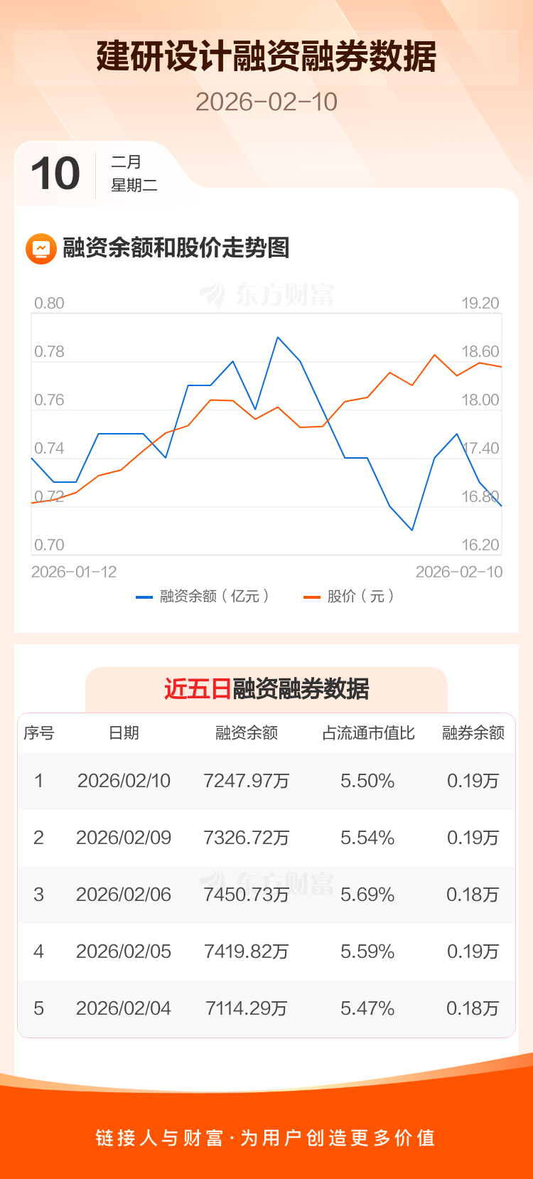 交易所最新数据显示,建研设计于2026年2月10日获融资买入209.85万元,融资偿还288.59万元,当日融资净偿还78.75万元。目前,该股融资余额7247.97万,占流通市值比例为5.50%。