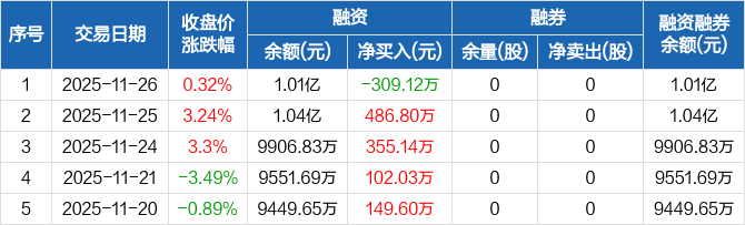 零点有数:融资净偿还309.12万元,融资余额1.01亿元(11-26)