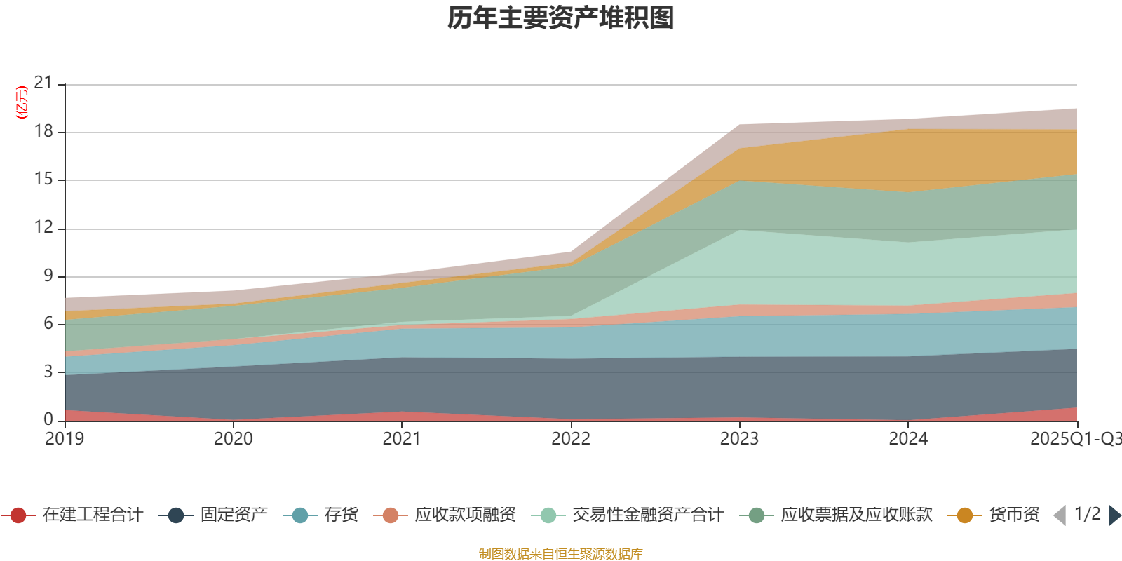 资产重大变化方面,截至2025年三季度末,公司货币资金较上年末减少29.39%,占公司总资产比重下降6.67个百分点;在建工程合计较上年末增加2244.7%,占公司总资产比重上升4.03个百分点;固定资产较上年末减少8.02%,占公司总资产比重下降2.36个百分点;其他非流动资产较上年末增加706.3%,占公司总资产比重上升2.31个百分点。