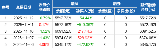 锡南科技:融资净偿还54.44万元,融资余额5517.72万元(11-12)
