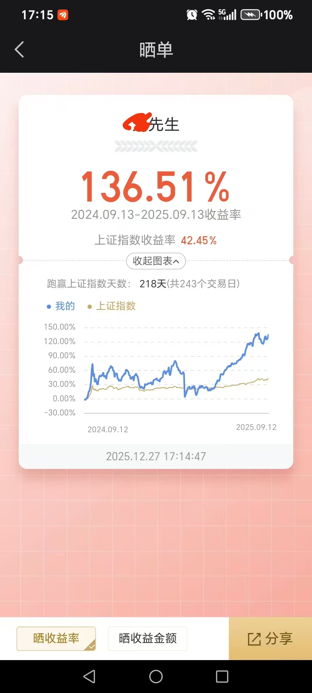 过去的2025年,是充满挑战与大好时机的一年,是我们大展宏图的一年,是我们收获满满的一年,是我们幸福的一年!虽然上证大盘指数只涨了617点(涨幅18..41%),但我的收益却超过了100%。