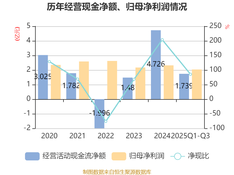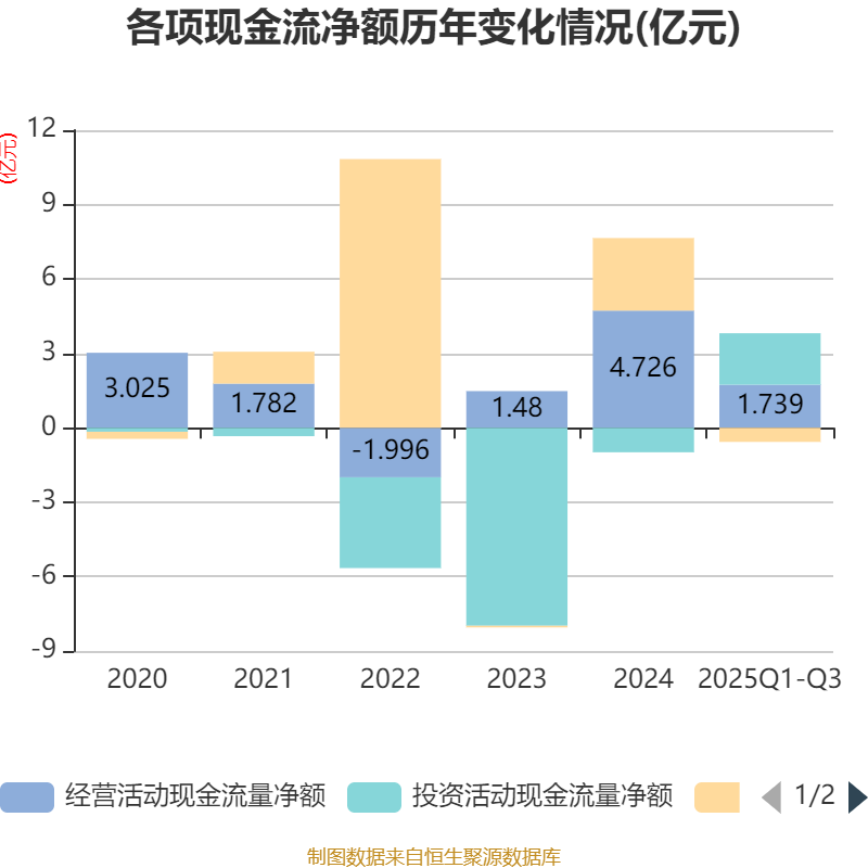 2025年前三季度,公司经营活动现金流净额为1.74亿元,同比下降49.56%;筹资活动现金流净额-5678.97万元,同比减少4.21亿元;投资活动现金流净额2.07亿元,上年同期为-6728.76万元。