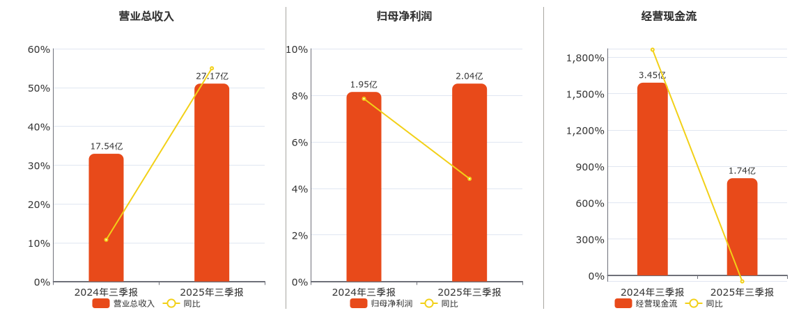 公司营业总收入为27.17亿元。归母净利润为2.04亿元。经营活动现金净流入为1.74亿元,较去年同报告期经营活动现金净流入减少1.71亿元,同比较去年同期下降49.56%。