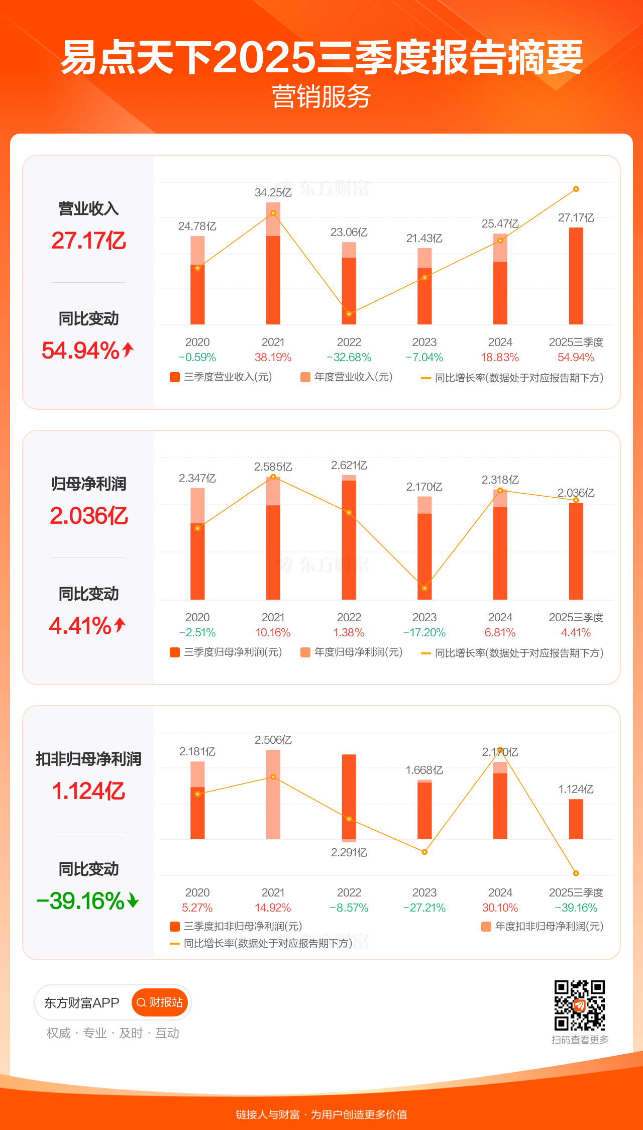 易点天下10月28日发布2025年三季报显示,公司前三季实现营业收入27.17亿元,同比增长54.94%;归母净利润2.04亿元,同比增长4.41%;扣非归母净利润1.12亿元,同比下滑39.16%。