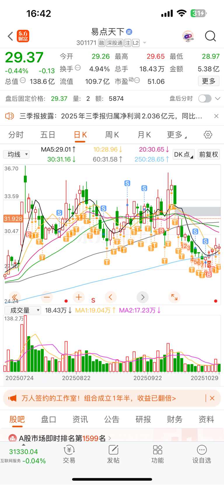 大盘3500,我34块进来的。现在大盘4000,你居然29.39。大盘涨10多个