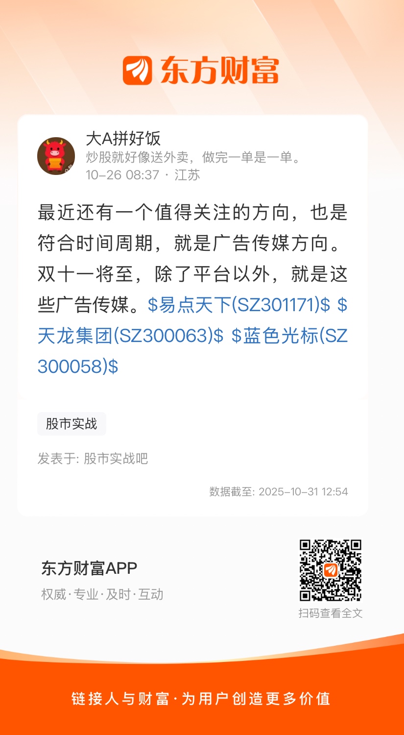 最近还有一个值得关注的方向,也是符合时间周期,就是广告传媒方向。双十一将至,除了平台以外,就是这些广告传媒。$易点天下(SZ301171)$ $天龙集团(SZ300063)$ $蓝色光标(SZ300058)$