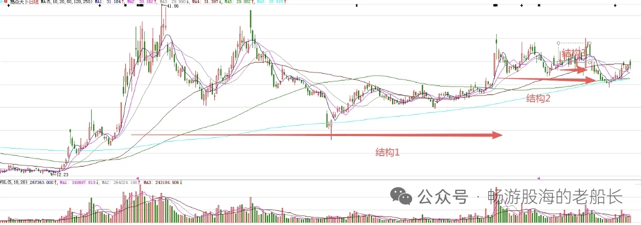 图中标注的大型结构1突破,意味着股价处在比较大的上涨趋势。结构2和结构3是结构1突破后的回踩,意味着后期有波段上涨。目前,波段上涨大概率已经拉开帷幕。