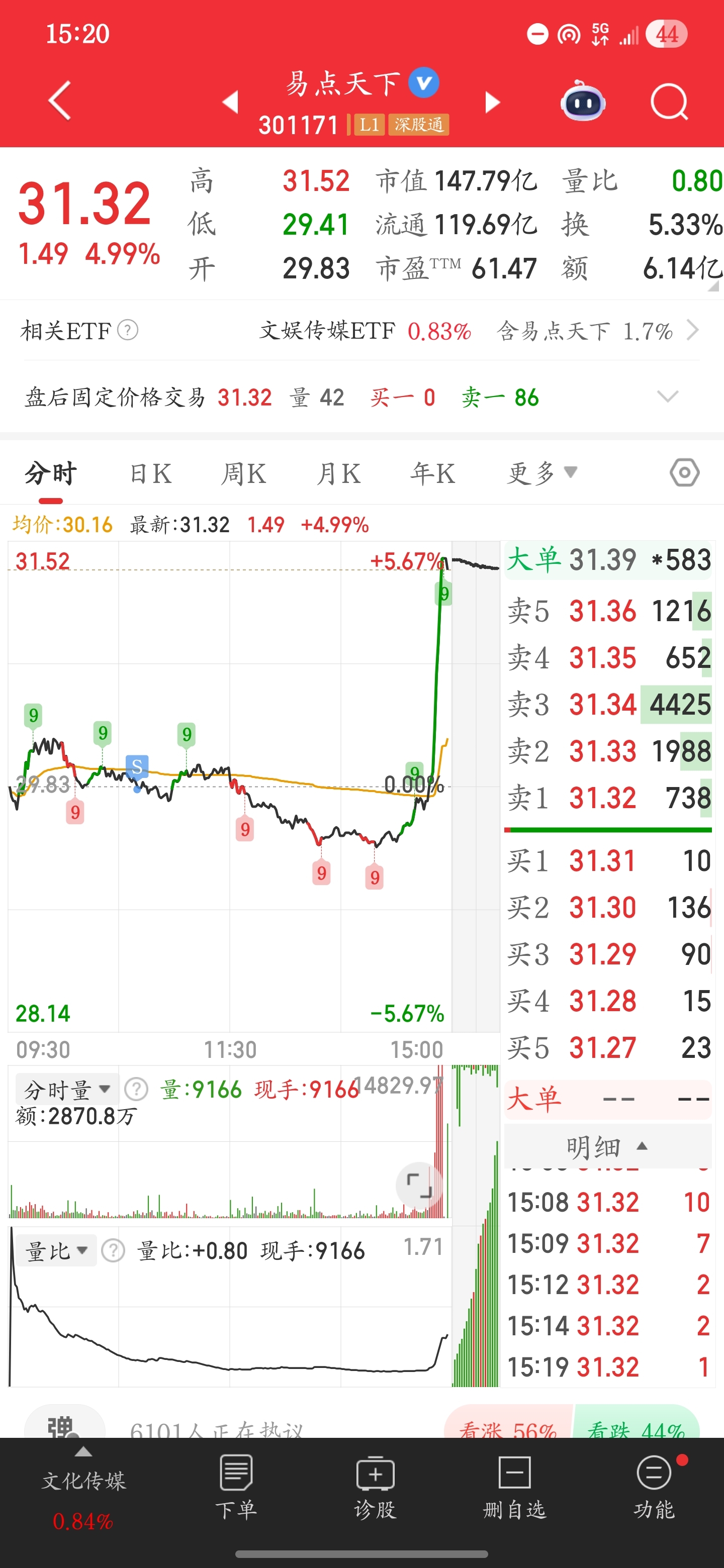 $易点天下(SZ301171)$ 拿了好几个月了一卖就涨