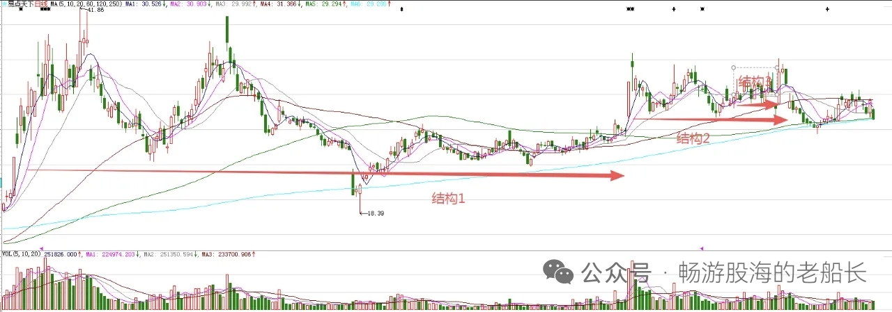 $易点天下(SZ301171)$ 比预期的大的明显。短线来看,下周初股价还有调整。不过,股价到了年线附近,继续调整的空间不大了。这依然是图中标注的结构2和结构3突破后的回踩,只是回踩的过程比较取证,反复上下震荡。图中标注的大型结构1突破,意味着股价处在比较大的上涨趋势。结构2和结构3是结构1突破后的回踩,意味着后期有波段上涨。