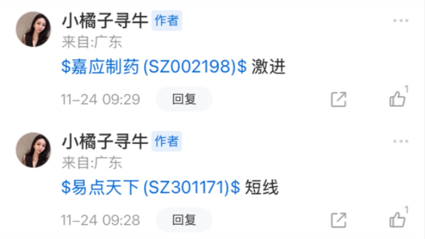 橘子进了的有:$易点天下(SZ301171)$ 、嘉应制药。 以上已卖出