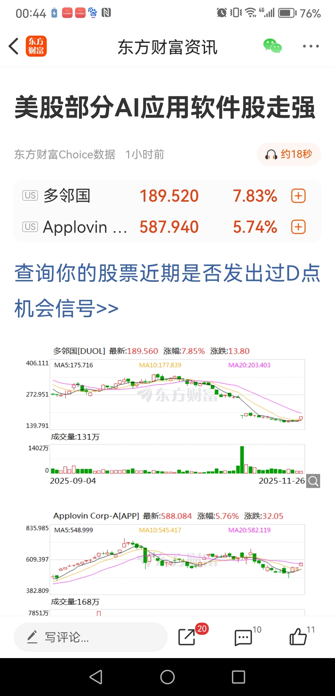 $易点天下(SZ301171)$ 美股部分AI应用软件股走强,多邻国涨超7%,Applovin涨超5%