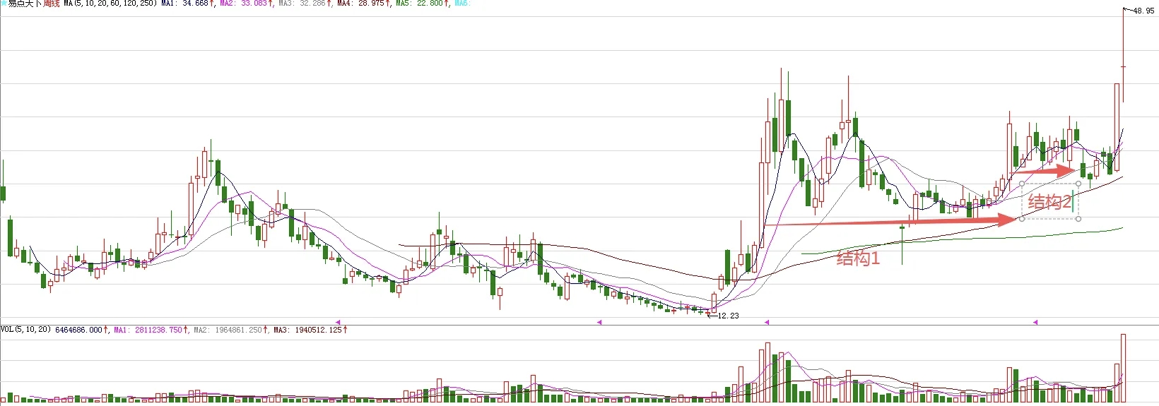 $易点天下(SZ301171)$ 周K线上下影线都很长,实体比较小,但是从收盘来看,说明这是明显的洗盘信号。毕竟,这个K线出现在图中标注的结构1和结构2突破后的位置。图中标注的大型结构1突破,意味着股价处在比较大的上涨趋势。结构2是结构1突破后的回踩,意味着后期有波段上涨。目前,结构2已经突破,本周是强势洗盘。下周短暂调整后,股价大概率还会继续波段上涨。