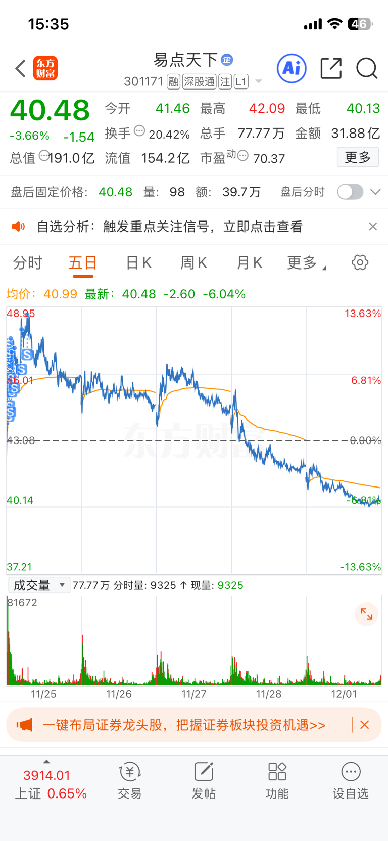 $易点天下(SZ301171)$ 等补完下面的缺口再来看了,软件应用持续性太弱,大涨一波后基本都是A杀