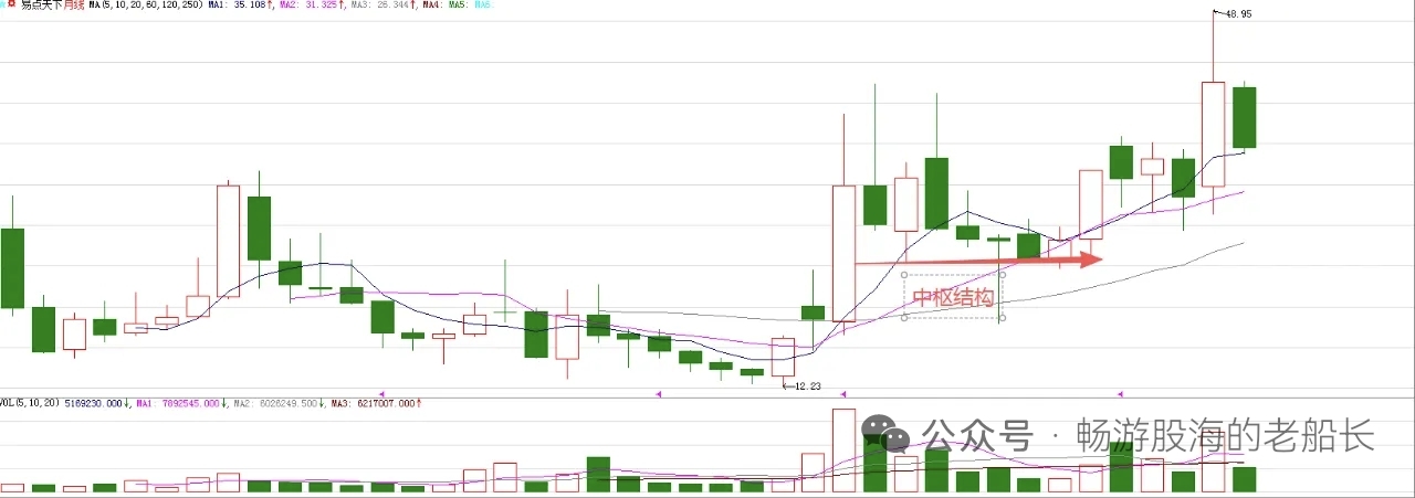 $易点天下(SZ301171)$ 月线本月调整,回踩了五单位均线。周期面来看,最近一段上涨,到十月份走到了第五个有效周期,是变盘节点,目标是回踩五月均线,已经回踩到位了。图中标注的中枢结构突破,意味着股价处在比较大的上涨趋势。只是走出了新高点之后,有回踩需求。现在,已经回踩到位。所以,接下来,股价大概率会逐步进入到新的波段上涨。