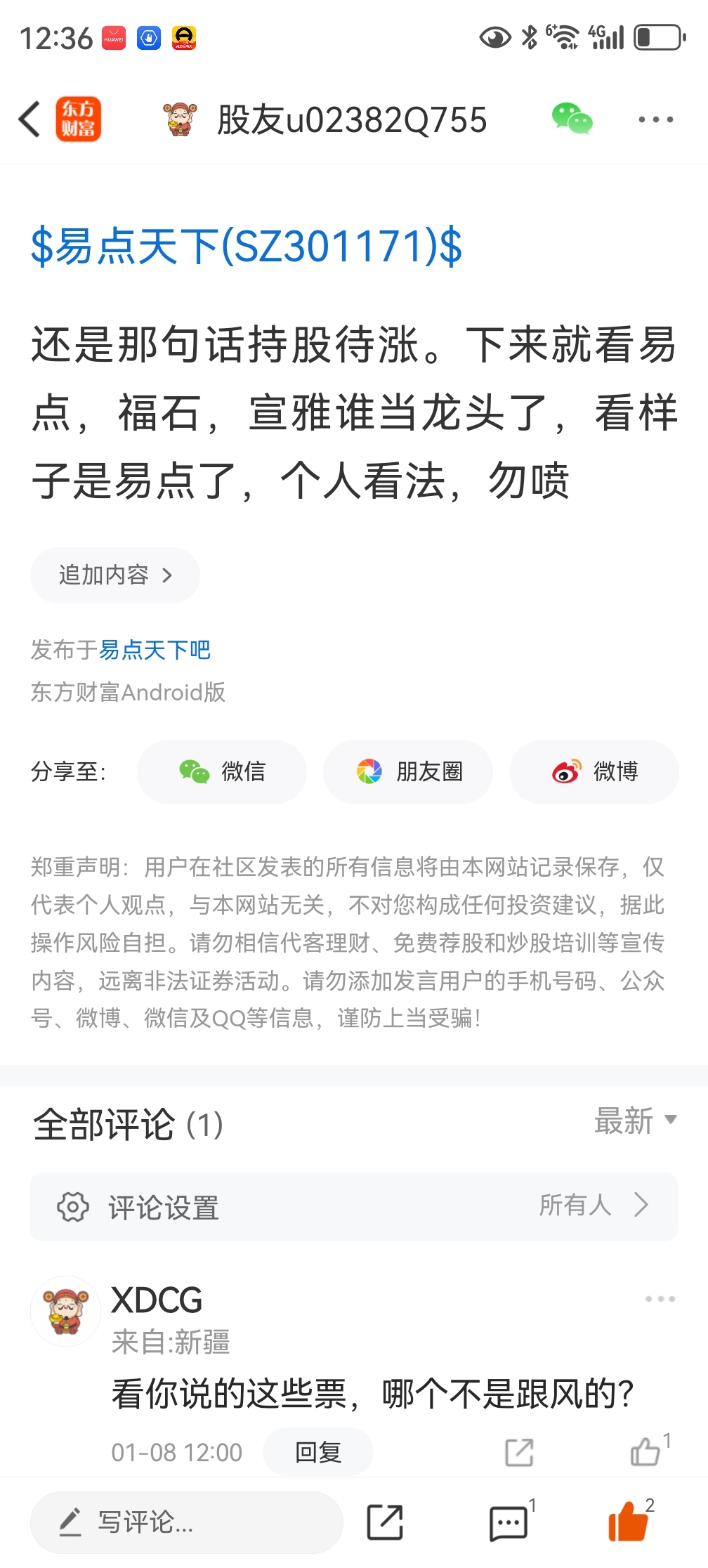 温馨提示: 1.根据《证券法》规定,禁止编造、传播虚假信息或者误导性信息,扰乱证券市场;2.用户在本社区发表的所有资料、言论等仅代表个人观点,与本网站立场无关,不对您构成任何投资建议。用户应基于自己的独立判断,自行决定证券投资并承担相应风险。《东方财富社区管理规定》