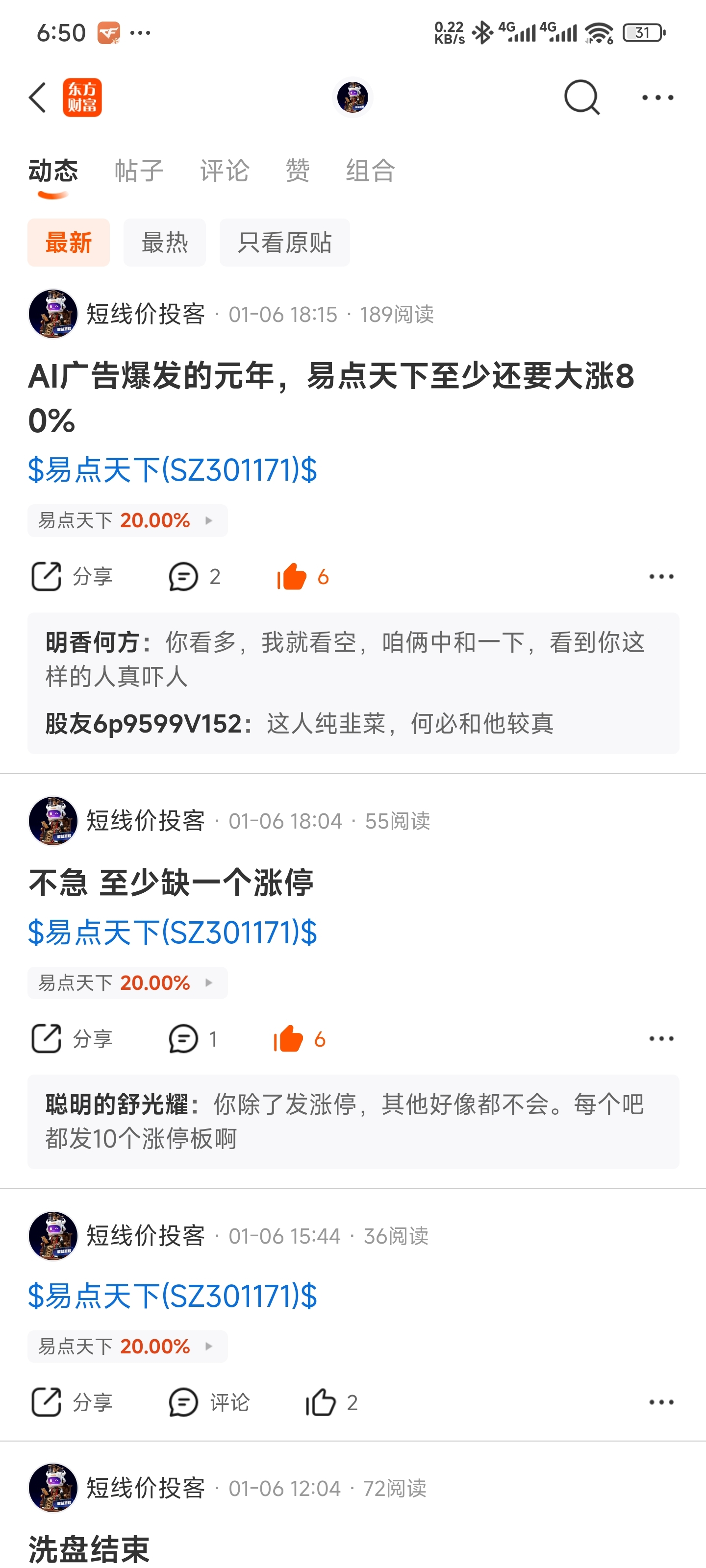 温馨提示: 1.根据《证券法》规定,禁止编造、传播虚假信息或者误导性信息,扰乱证券市场;2.用户在本社区发表的所有资料、言论等仅代表个人观点,与本网站立场无关,不对您构成任何投资建议。用户应基于自己的独立判断,自行决定证券投资并承担相应风险。《东方财富社区管理规定》