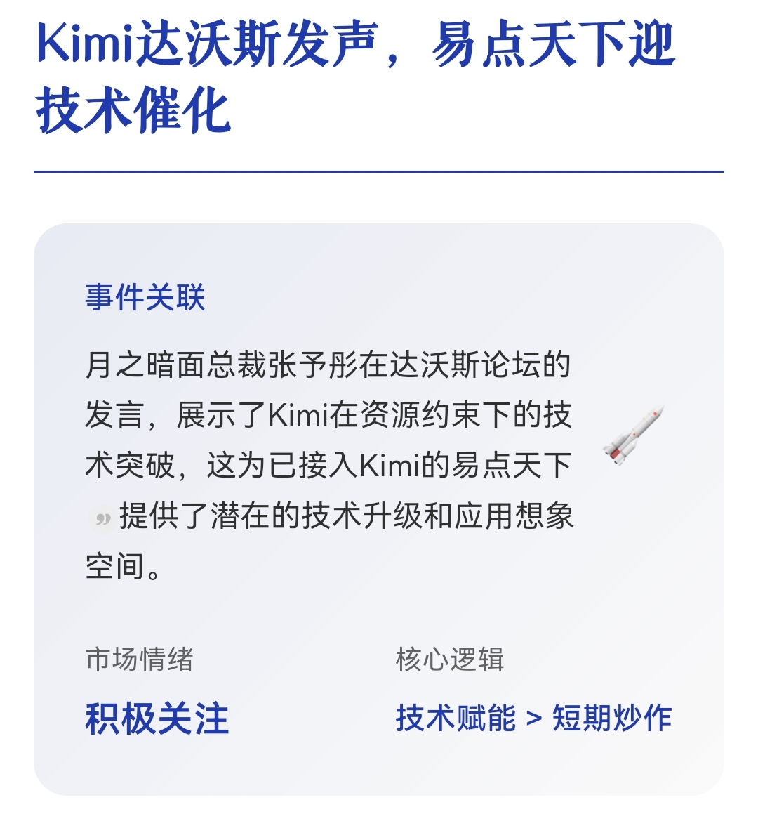 $易点天下(SZ301171)$ 北京时间1月21日晚,月之暗面(Moonshot AI)总裁张予彤在瑞士达沃斯世界经济论坛2026年年会上发表演讲,强调中国AI公司通过算法与系统创新,在有限算力资源下实现技术突破。作为已公开接入Kimi Chat的A股上市公司,易点天下(301171.SZ)与这一前沿技术动态存在直接关联。