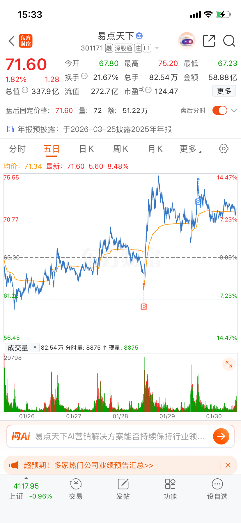 $易点天下(SZ301171)$ 多亏了易点,这个月在最后两天转亏为盈,太感谢了