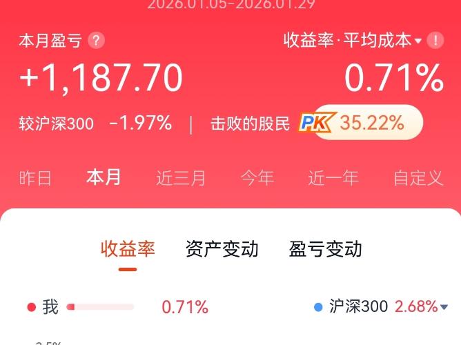 一月账户收益几乎没有,主因还是所持三个票都在回落调整中,特别是上周四一日吐血近3K,能保住本金感觉还不错,2月份所持股票应该调整结束,可能收益会比1月好些,但总体感觉今年股市不好做,赚钱不易,大盘和多数个股都在高位,所以获利目标暂定为20%。