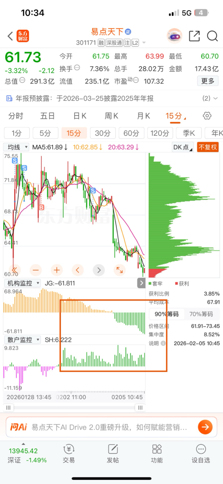 $易点天下(SZ301171)$ 主力大举出逃,散户大举买入!
