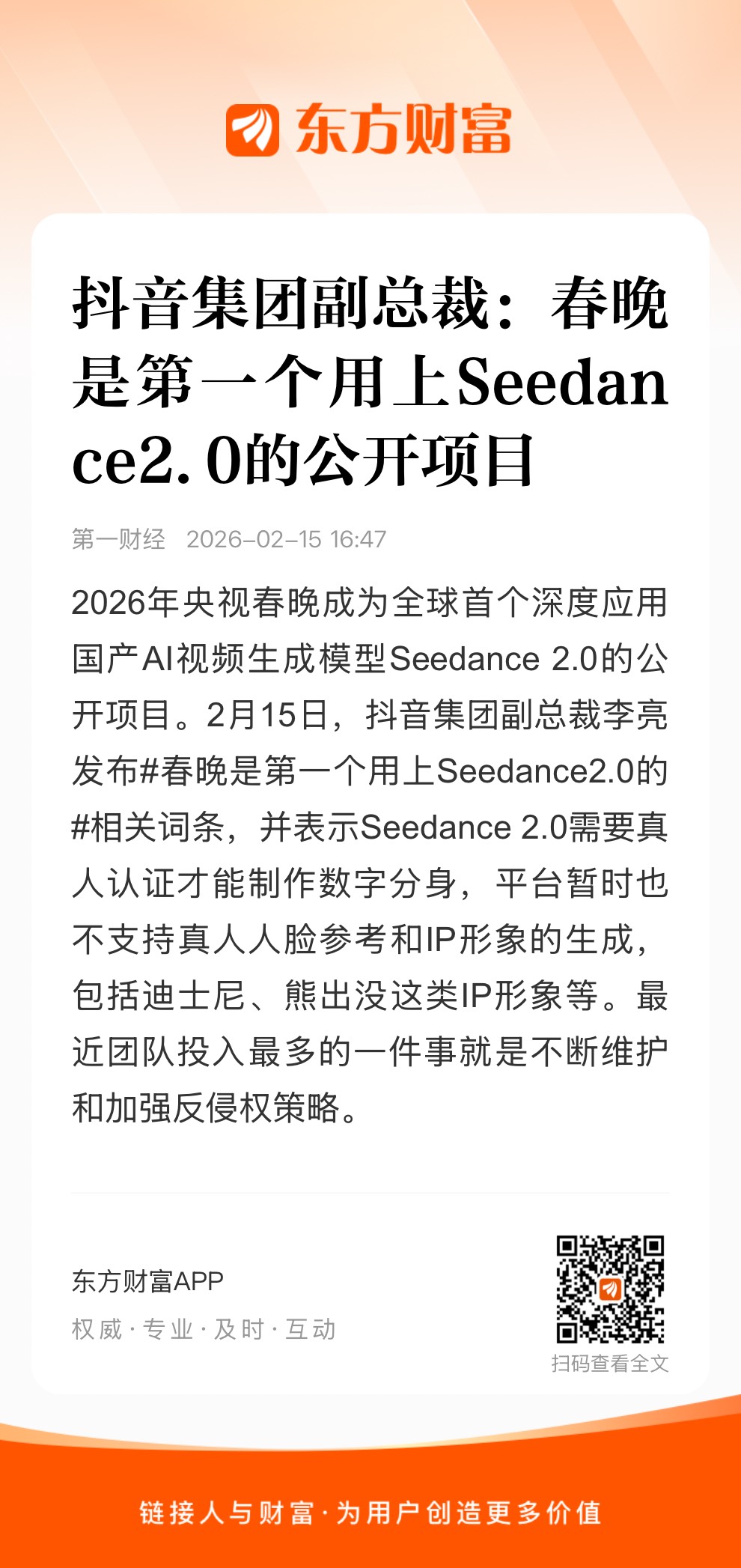 2026年央视春晚成为全球首个深度应用国产AI视频生成模型Seedance 2.0的公开项目。2月15日,抖音集团副总裁李亮发布#春晚是第一个用上Seedance2.0的#相关词条,并表示Seedance 2.0需要真人认证才能制作数字分身,平台暂时也不支持真人人脸参考和IP形象的生成,包括迪士尼、熊出没这类IP形象等。最近团队投入最多的一件事就是不断维护和加强反侵权策略。