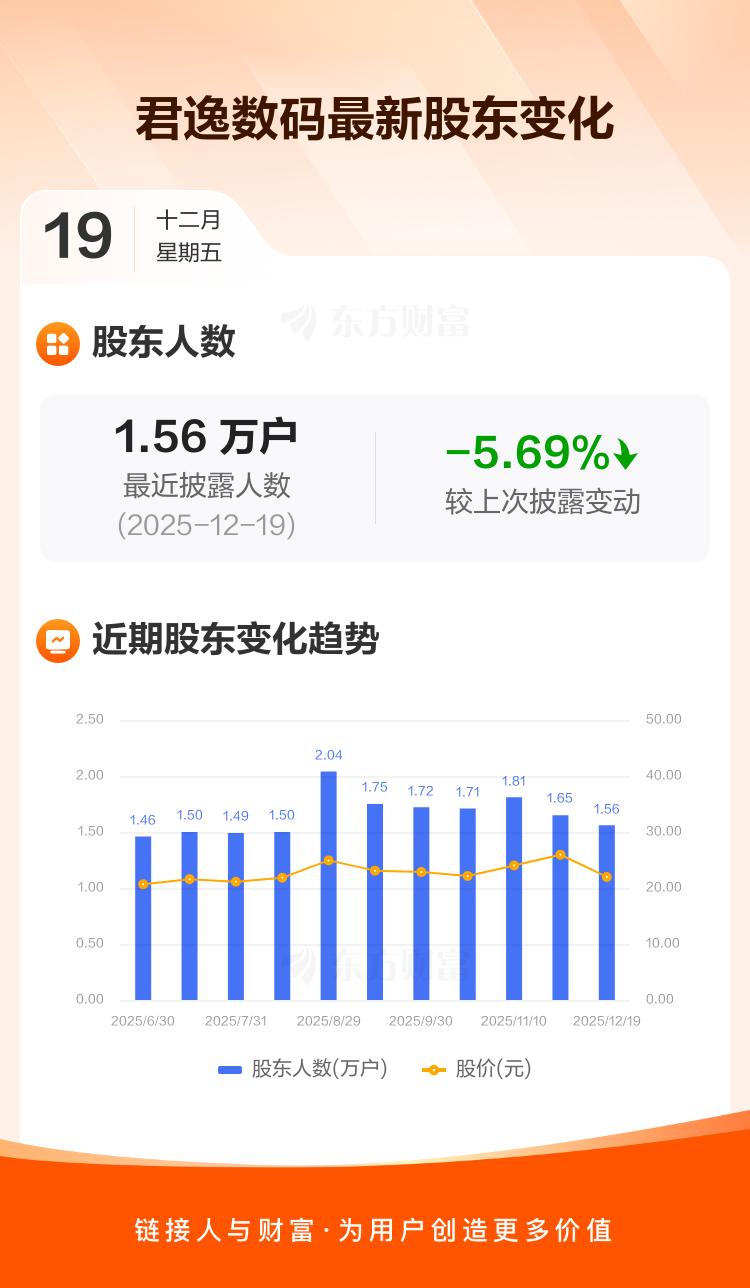 君逸数码最新披露数据显示,截至12月19日公司股东户数为1.56万户,较上期(2025年11月20日)减少940户,降幅为5.69%。户均持有流通股数量由上期的5976股上升至6336股,户均持股金额由上期的15.50万元减少至13.93万元。