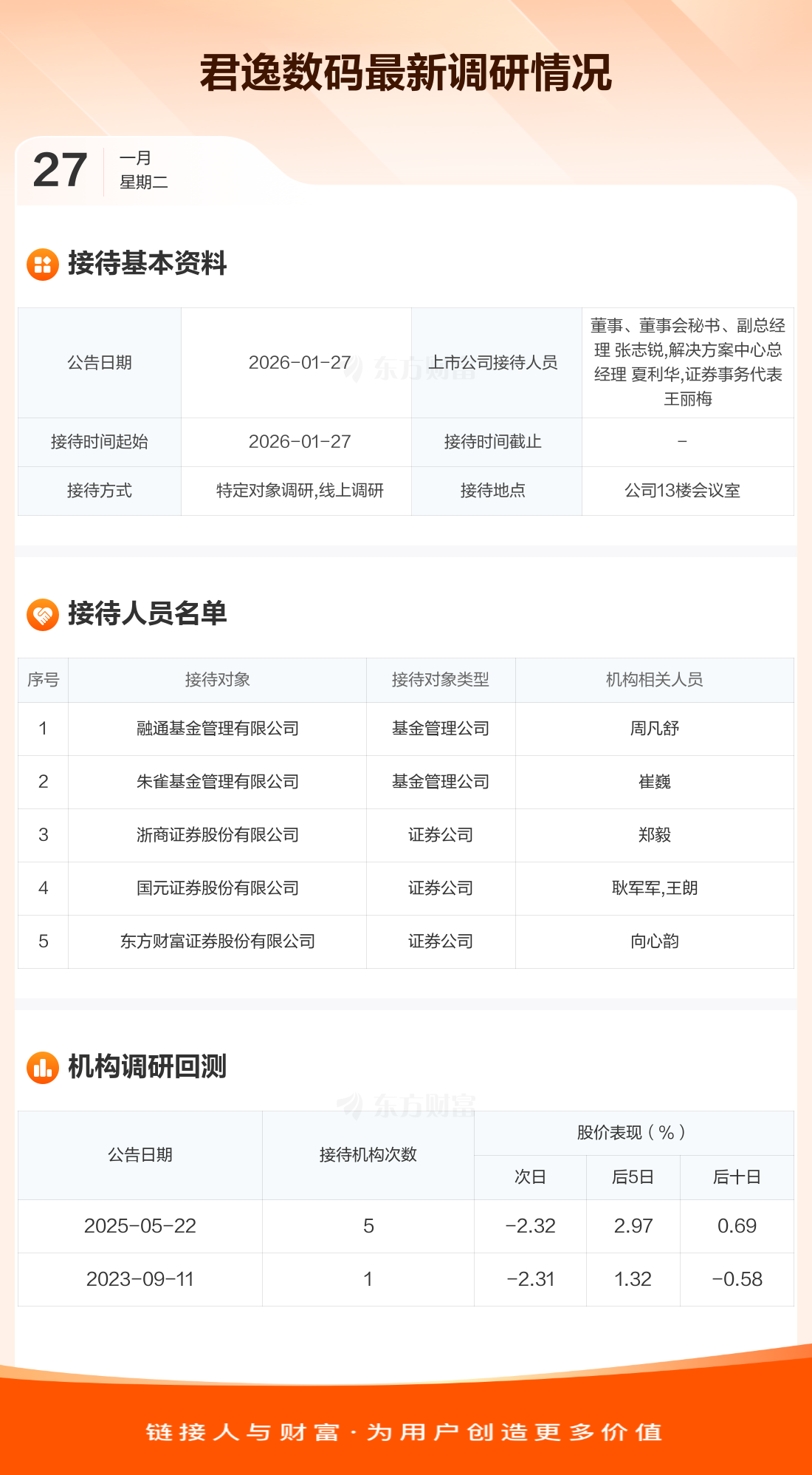 君逸数码1月27日公告称,1月27日接待融通基金管理有限公司等5家机构调研。接待人员包括董事、董事会秘书、副总经理 张志锐,解决方案中心总经理 夏利华,证券事务代表 王丽梅。