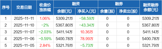 毓恬冠佳:融资净偿还58.59万元,融资余额5309.21万元(11-11)