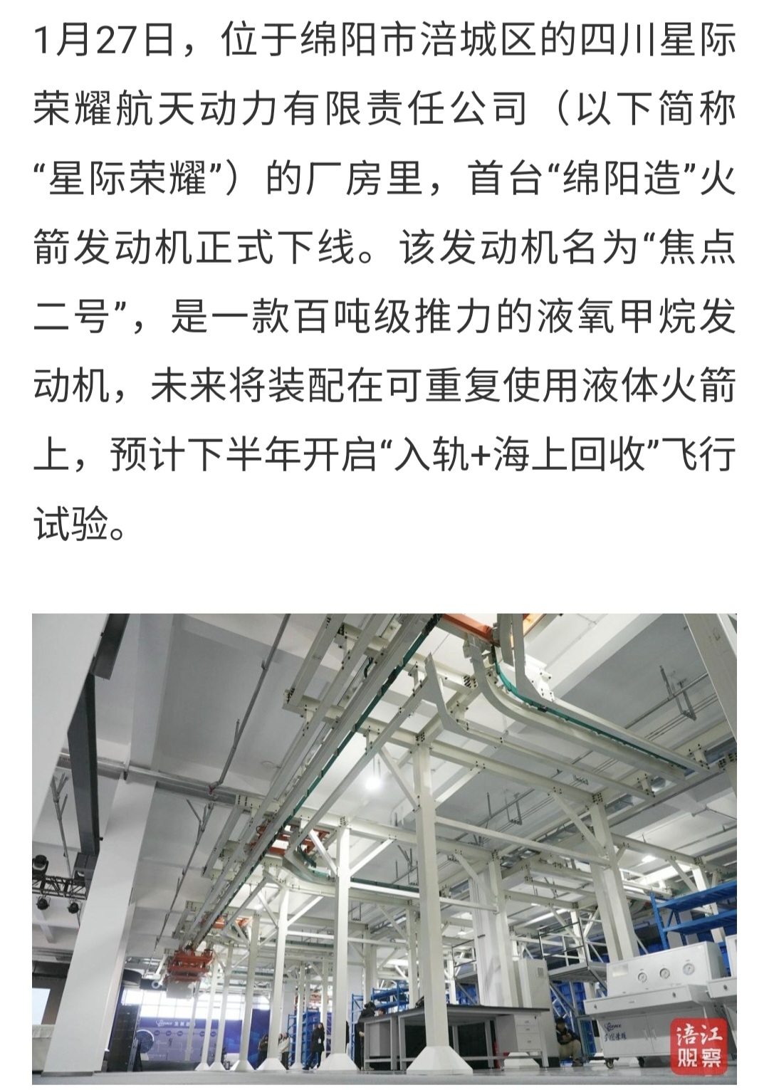 首台“焦点二号”百吨级液氧甲烷发动机在绵阳涪城区顺利下线,标志着一期年产50台发