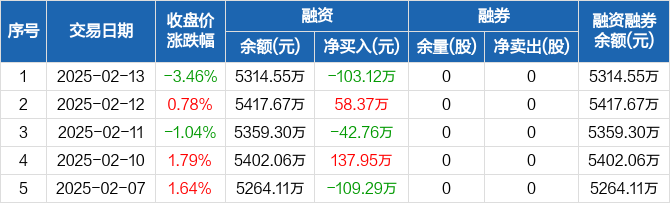 逸豪新材:融资净偿还103.12万元,融资余额5314.55万元(02-13)