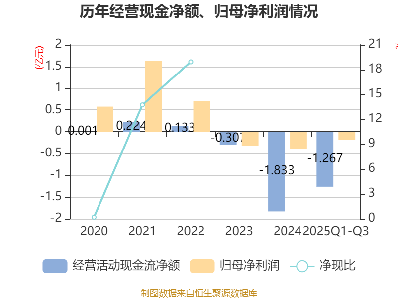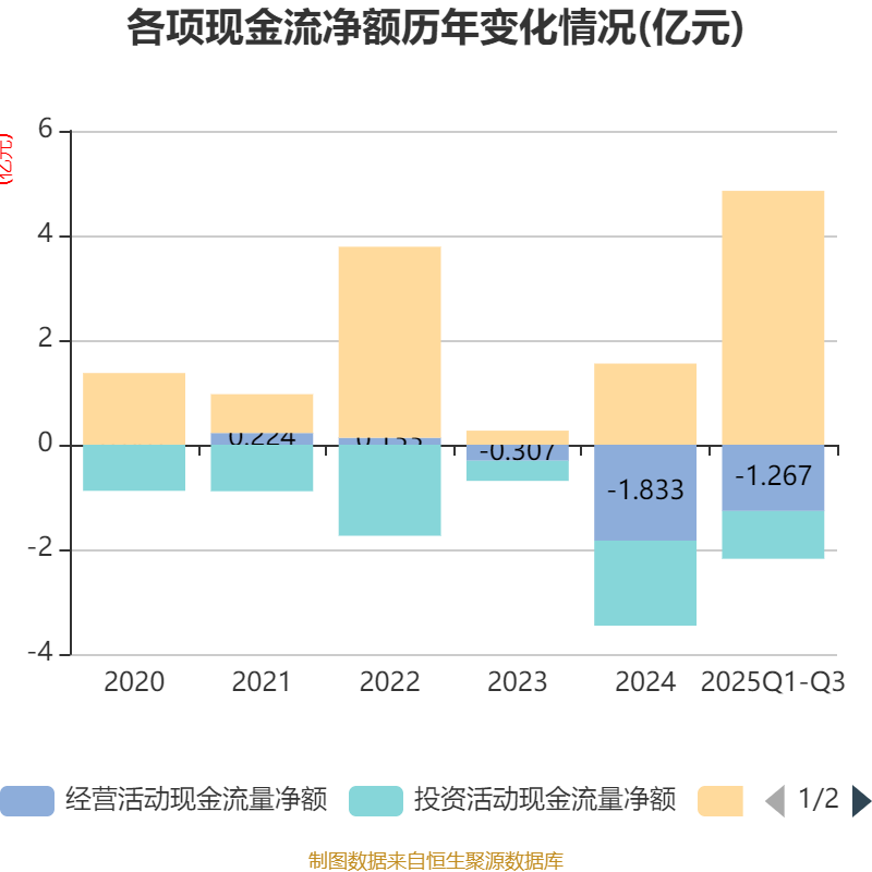 2025年前三季度,公司经营活动现金流净额为-1.27亿元,同比增加4466.59万元;筹资活动现金流净额4.85亿元,同比减少2250.29万元;投资活动现金流净额-9132.66万元,上年同期为-1.84亿元。