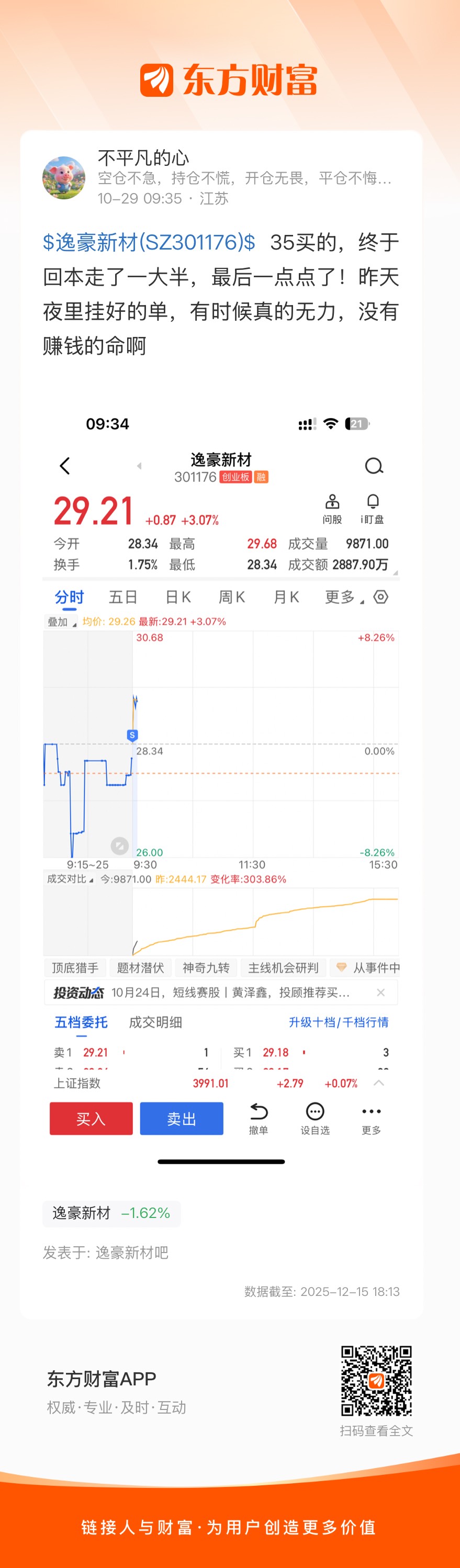 $逸豪新材(SZ301176)$  35买的,终于回本走了一大半,最后一点点了!昨天夜里挂好的单,有时候真的无力,没有赚钱的命啊