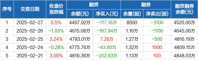 迪阿股份:融资净偿还117.16万元,融资余额4497.92万元(02-27)