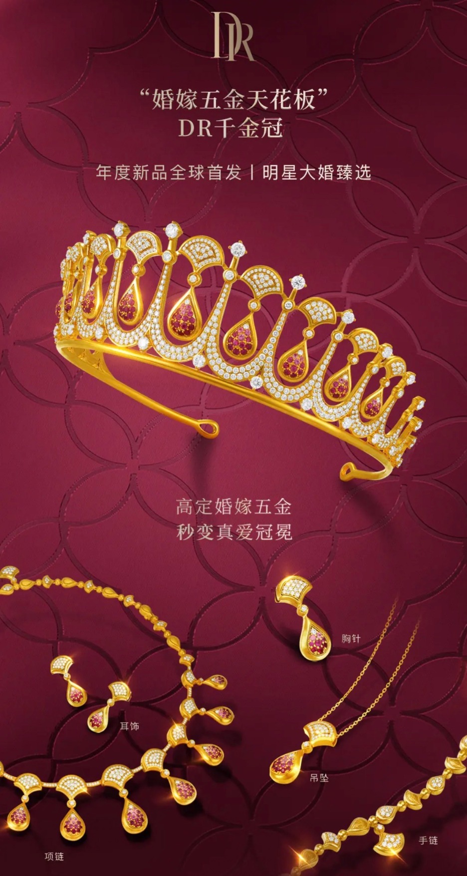 作为高端婚嫁珠宝的革新者,迪阿股份不断以匠心与情感温度重塑行业标准。此次DR推出的婚嫁五金,每套作品均由资深匠人纯手工打造,融合皇家美学与珠宝级匠艺,以西方冠冕为廓形基底,将中式美学意象中的龙凤、并蒂同心结、蝴蝶、牡丹、百合等元素精巧嵌入,主体采用高纯度黄金材质,温润光泽中蕴含“东方血脉觉醒”,让东方婚嫁美学在黄金载体上焕新绽放。这一设计既契合当代年轻人对“国际审美+东方文化”的双重需求,更让“用一生爱一人”的品牌理念有了具象化的文化表达。