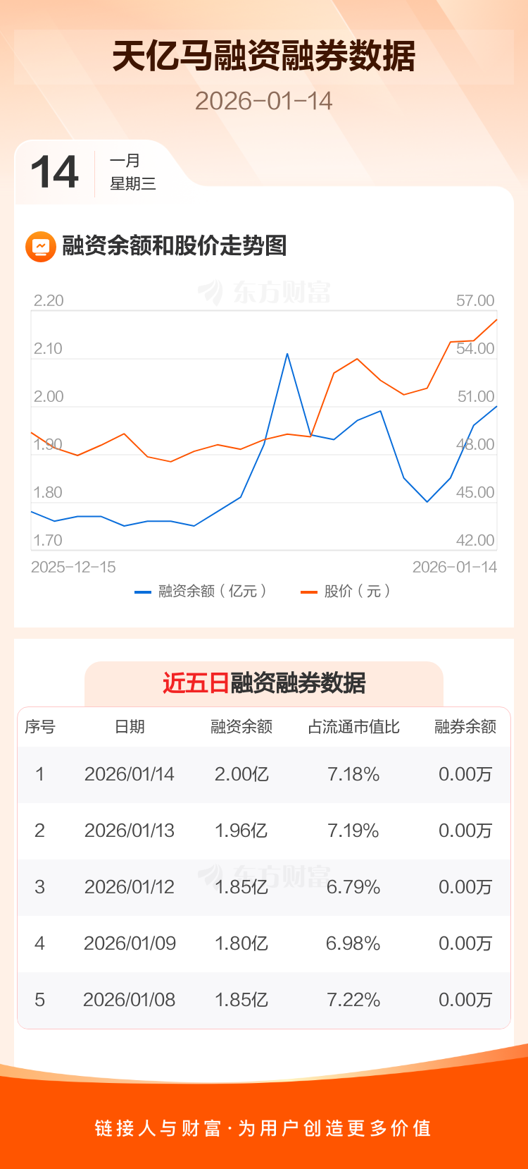交易所最新数据显示,天亿马于2026年1月14日获融资买入2902.28万元,融资偿还2458.66万元,当日融资净买入443.61万元。目前,该股融资余额2.00亿,占流通市值比例为7.18%。
