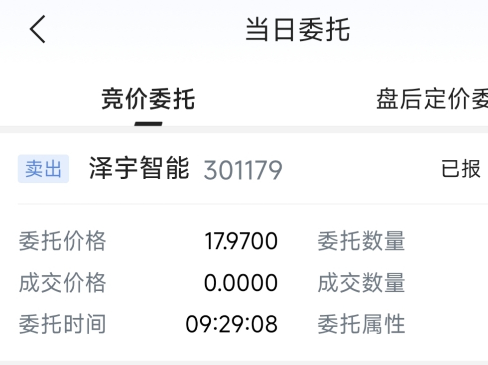 $泽宇智能(SZ301179)$ 神奇,9点半之前挂的17.97居然没成交。