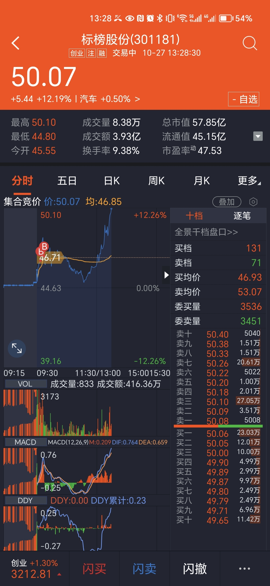 $标榜股份(SZ301181)$ 设置好45在继续买入,手贱又撤销了