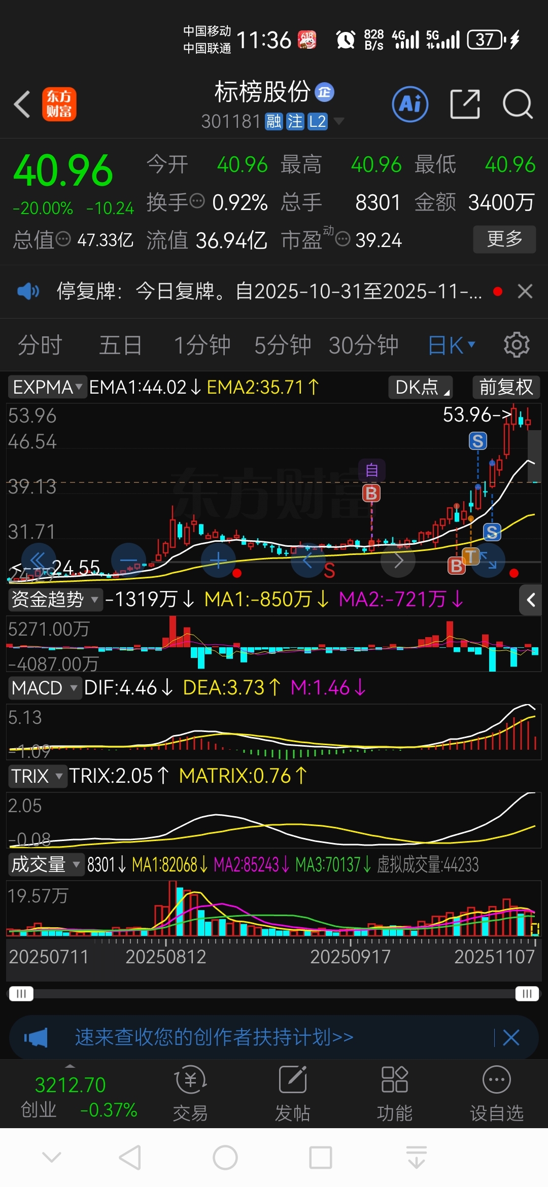 $标榜股份(SZ301181)$ 上个月尾获利清仓后继续涨,又停盘重组,我以为错过了翻倍牛股,今天直接一字跌停,唉,之前拉升,纯粹就是知道内幕的主力刻意拉升出货,在大A,有技术不如有运气,有运气不如有内幕