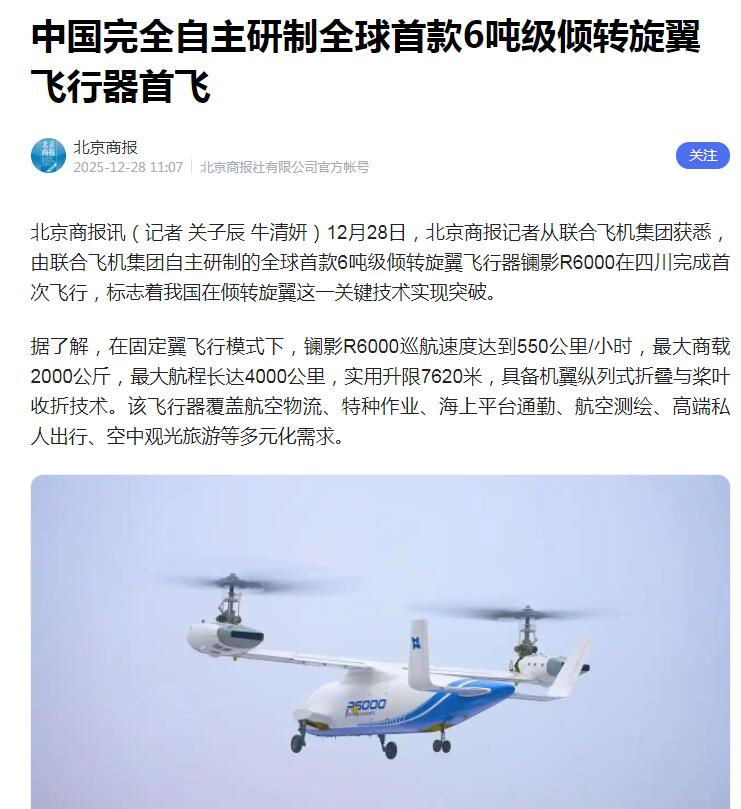 中国完全自主研制全球首款6吨级倾转旋翼飞行器首飞