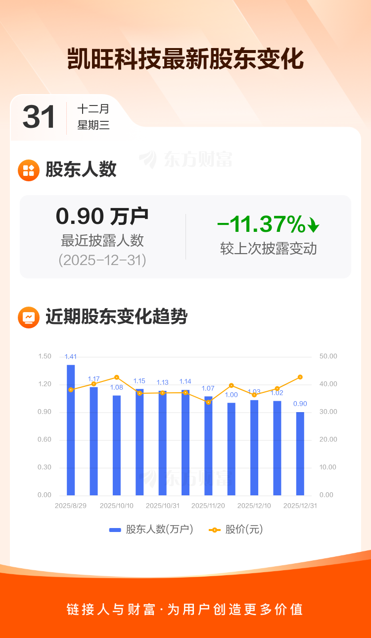 凯旺科技最新披露数据显示,截至12月31日公司股东户数为9044户,较上期(2025年12月19日)减少1160户,降幅为11.37%。户均持有流通股数量由上期的9390股上升至1.06万股,户均持股金额由上期的36.14万元增加至45.16万元。
